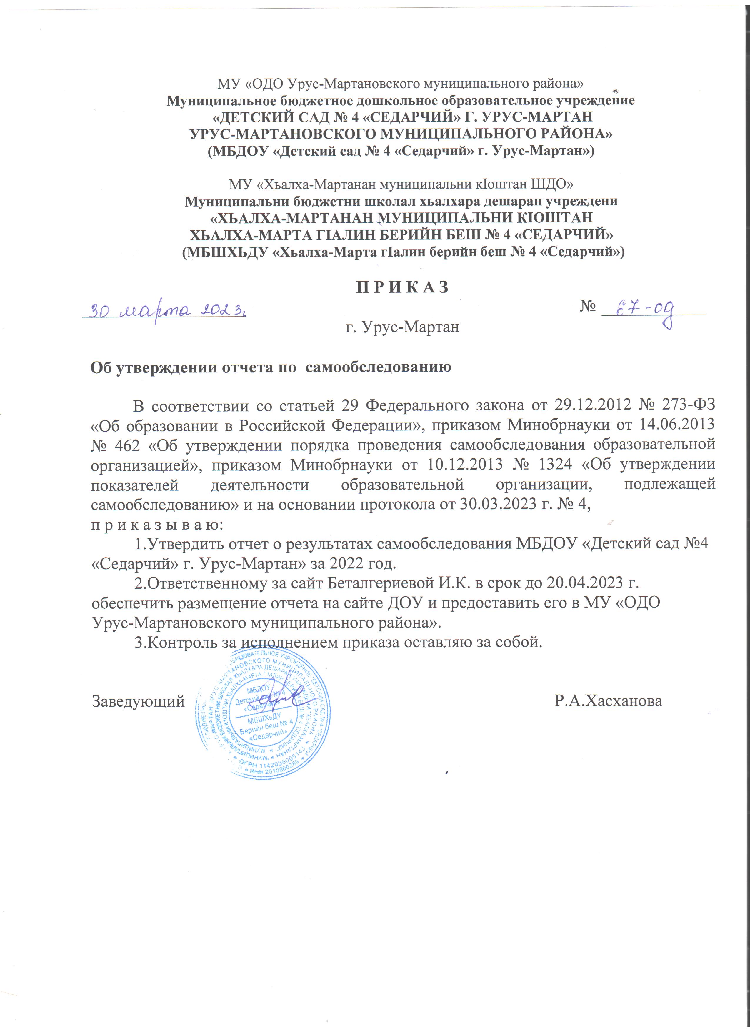 Приказ об утверждении Порядка предоставления учредителю отчета о результатах самообследования муниципальных бюджетных дошкольных образовательных учреждений Урус-Мартановского муниципального района