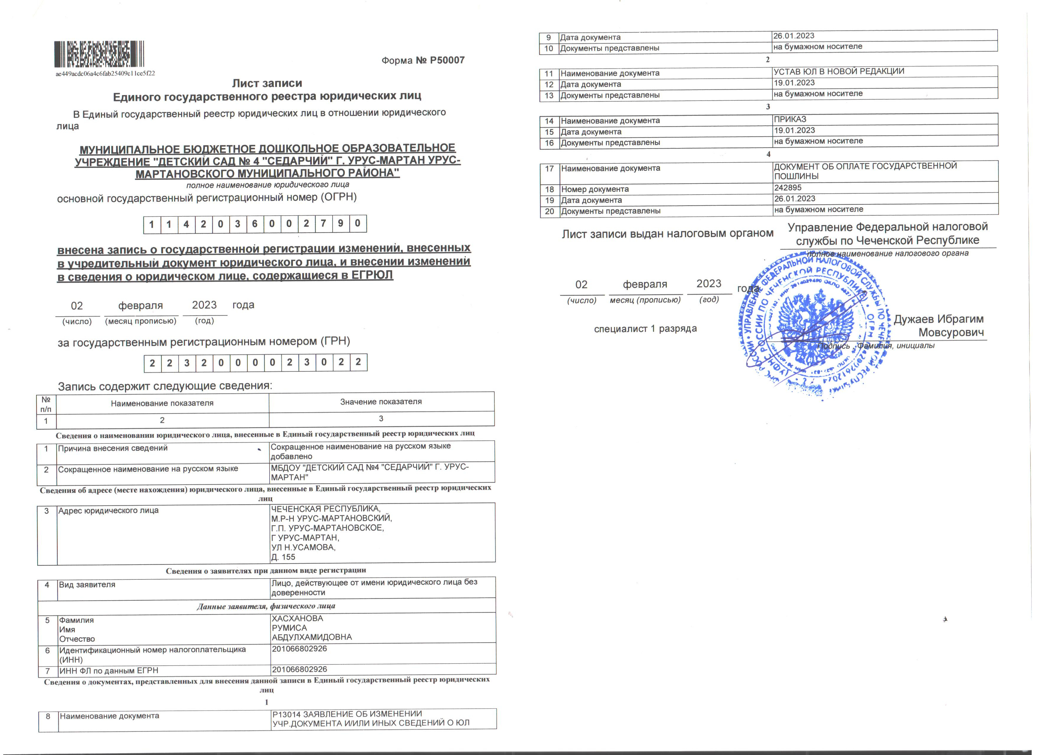 Основные сведения о «Детский сад №4 «Седарчий» г. Урус-Мартан Урус-Мартановского муниципального района»