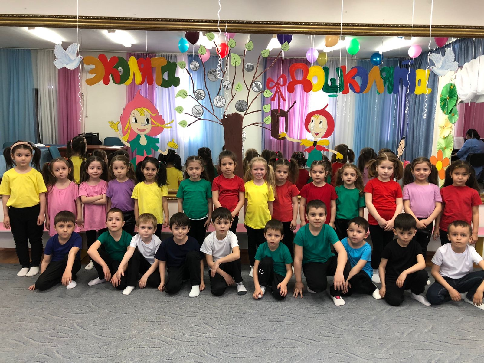 14 апреля мы в средней группе «Ромашки» провели утренник «Эколята-дошколята». Утренник был красочным, весь в зеленых красках, в весенней обстановке. Зал был оформлен шарами разноцветными. Дети были одеты в яркие формы, стояли фигуры эколят . Зеркало было разрисовано яркими красками на тему экологии. Дети читали стихи, пели песни . Танцевали танец «Эколята». Так же провели познавательные игры « Отгадай насекомые», «Назови одним словом», «Найди пару». Такие игры познавательно и положительно влияют на детишек, они с интересом участвуют в них .Дети в конце утренника дали клятву «Эколят». После утренника с детьми вышли во двор сада. Во дворе все красиво цвело, зелеными и желтыми красками переливались листья деревьев. Воздух был чистым и свежим. Вместе посадили клубнику и девочки полили наши посевы. Завязывали ленточки на саженцы. Всем очень понравилось наше экологические приключения .