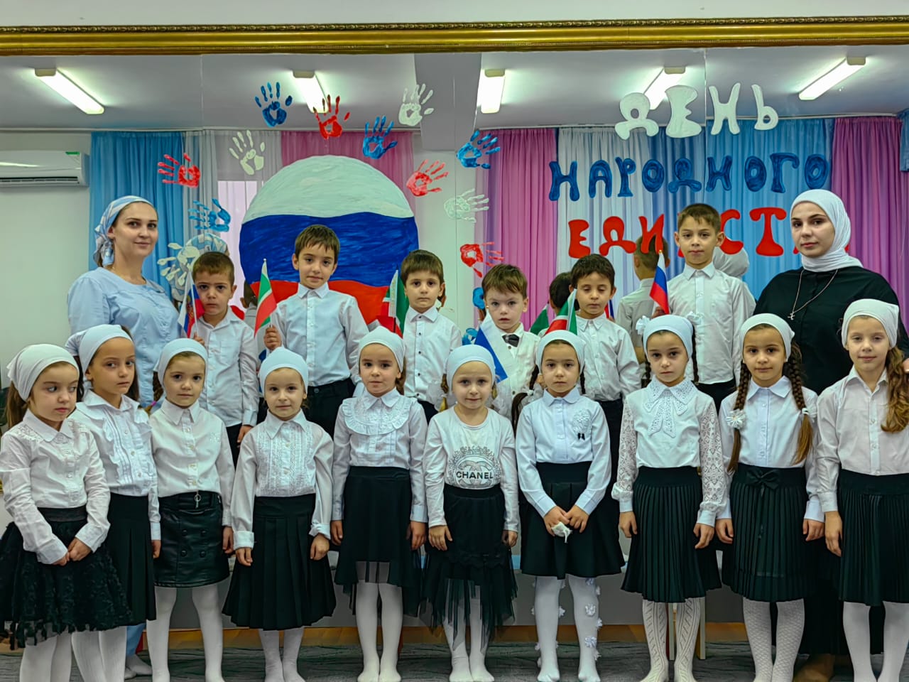 Дети празднично одеты (белый верх – чёрный низ), с российским флажком в руке, входят под торжественную музыку в зал. Образуют круг и исполняют Чеченский Гимн.