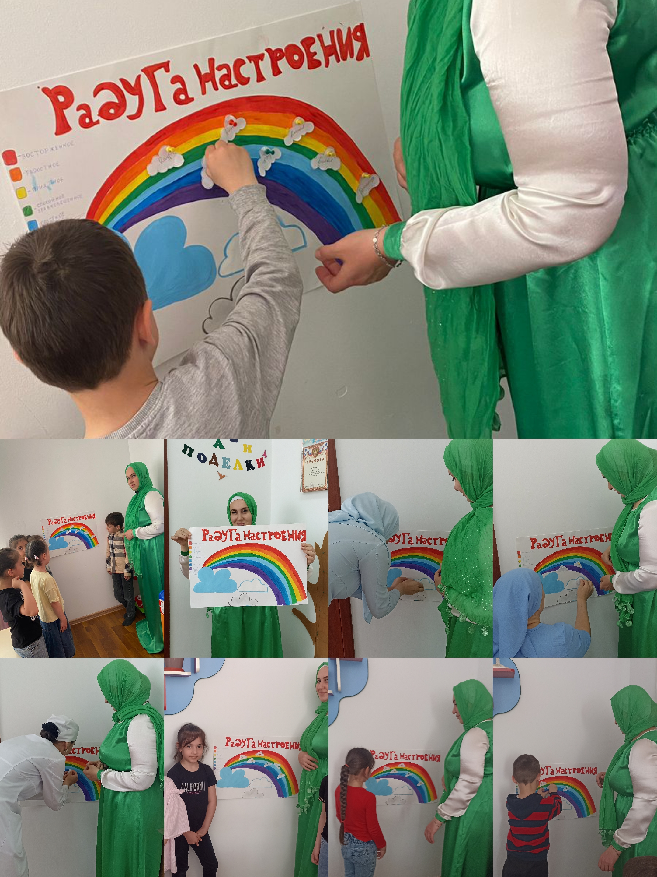 Таким образом, мы постарались, чтобы родители, дети и педагоги, входя в здание детского сада, почувствовали начало недели психологии. В холле, на магнитной доске, был выставлен лист ватмана, на котором изображена радуга и рядом на столе выложены вырезанные фигурки. Эти фигурки предлагалось наклеить на тот цвет радуги, который больше всего в настоящий момент участникам понравился. Эта психологическая акция «Радуга настроения», с целью изучения настроения детей и взрослых показала, что у большинства участников преобладало хорошее настроение. Для родителей предложена памятка на тему «Как воспитать счастливого ребенка». Для акцентирования внимания родителей на взаимосвязи родительской установки с эмоциональным благополучием и личностным развитием ребёнка.
