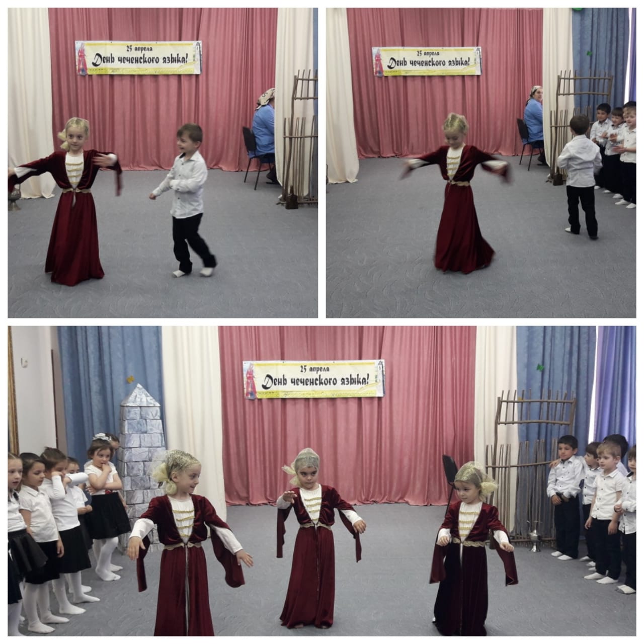 Девочки подготовительной группы показали национальный «Девичий» танец . Активное участие приняли дети из старших группы они так же пели песни и показывали сценки на чеченском языке. Такие мероприятия способствуют: развитию чеченского языка, национальной культуры, любви к родному языку и традициям, духовно-нравственному воспитанию. Нохчийнмотт, хьо бека бисалахьтахконзадисинчуаганна, ненанмотт,хьохезчохьбисалахь Нана мел езачубераннаНохчийнмоттхьо.
